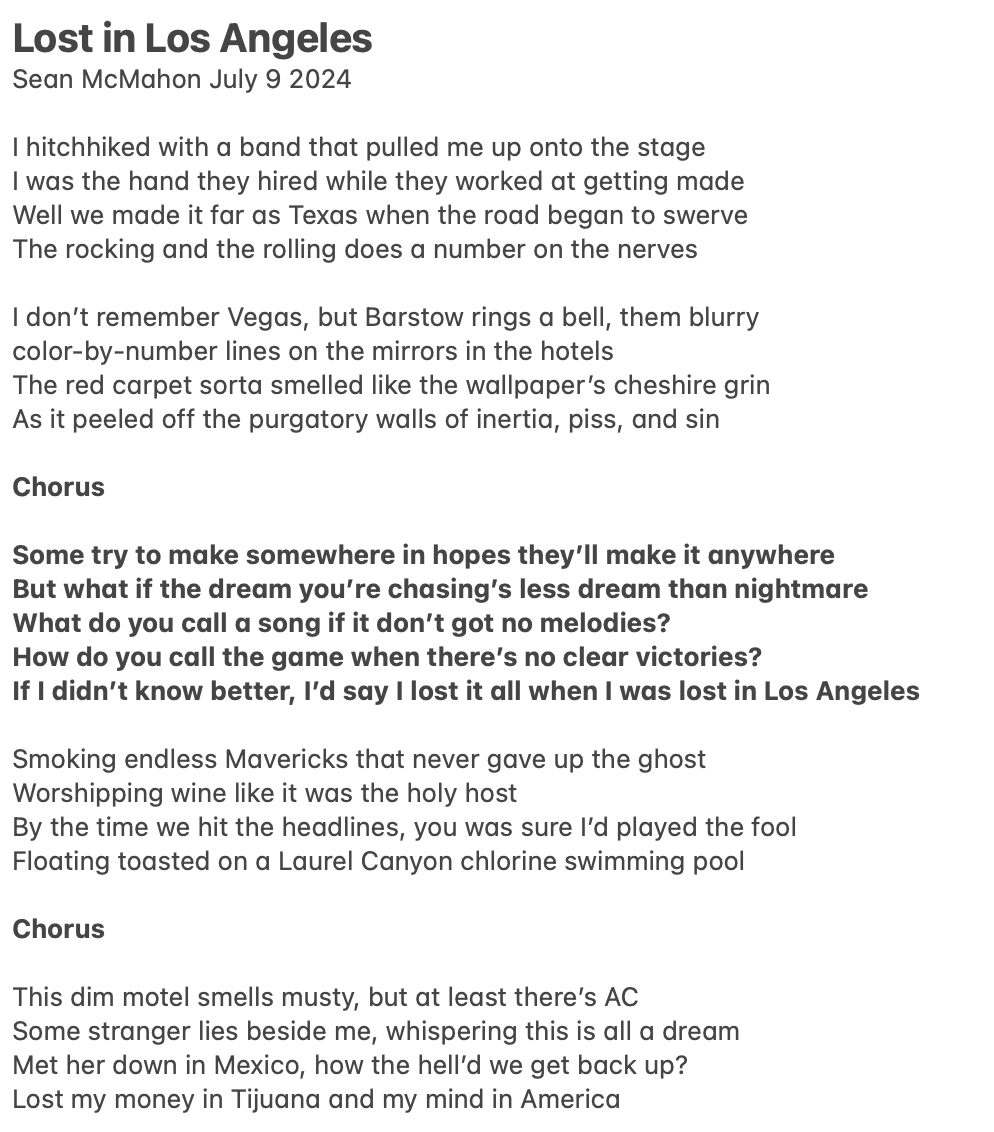Song of the Week: "Lost in Los Angeles""What if the dream you're chasing's less dream than nightmare?"This week’s song won’t be paywalled, Happy Easter! This is a country tune I wrote last summer, tales of past life, loves, and burnout on the road. Enjoy this solo rendition, recorded live at the Newes From America in Edgartown, MA. Let me know what you think! Listen Here:Upcoming Concerts:You're currently a free subscriber to Seán McMahon. For the full experience, upgrade your subscription. |